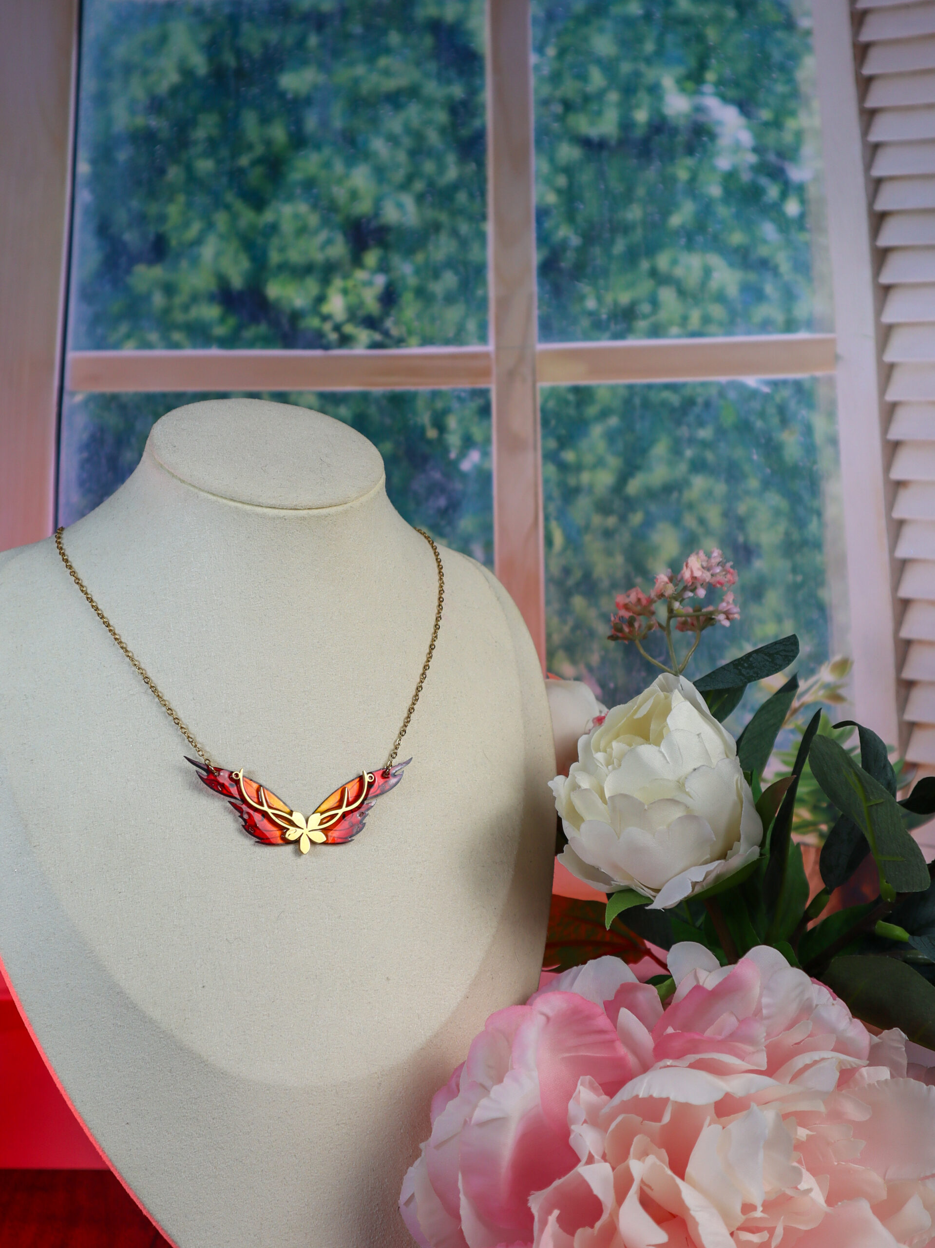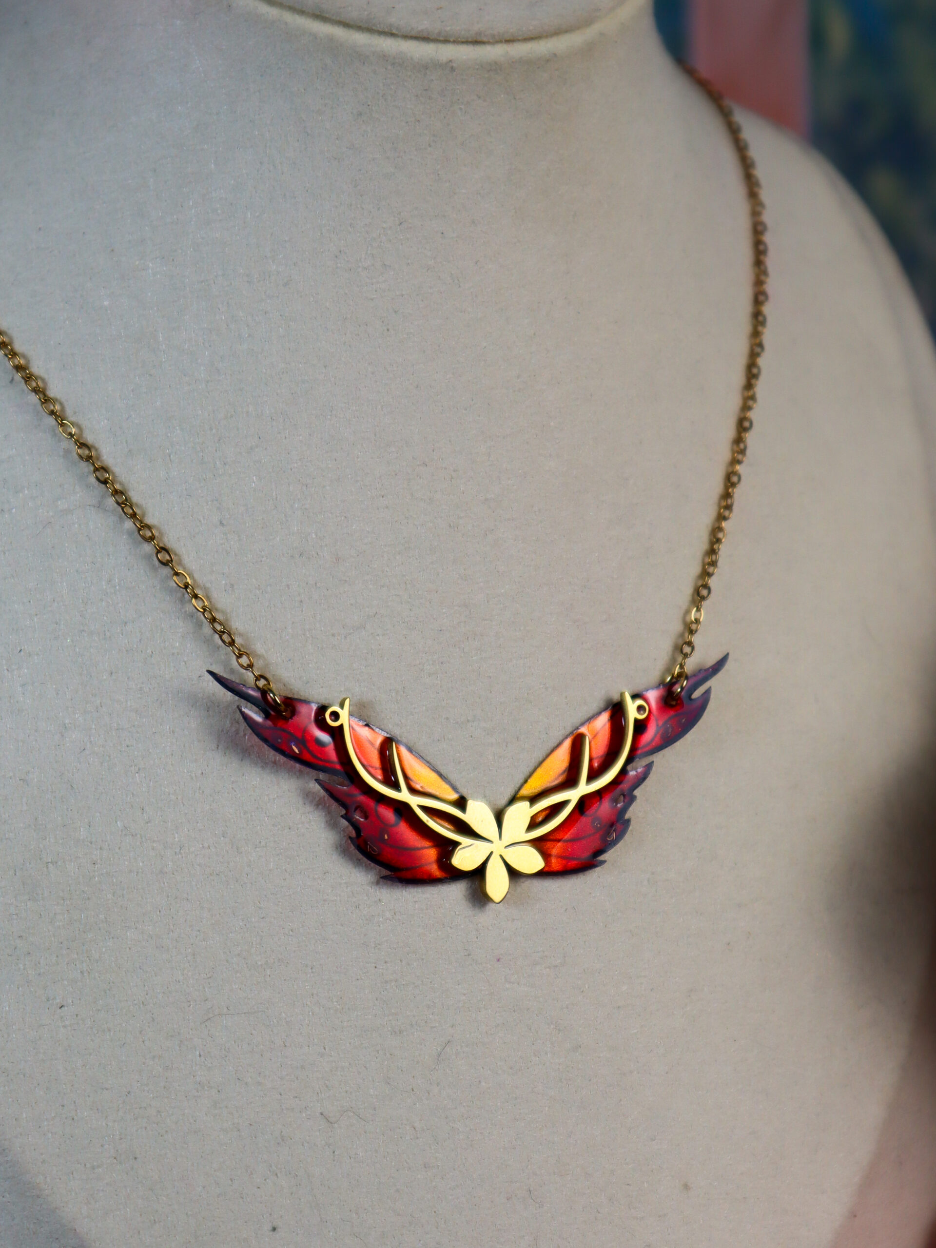 Ainsi, ses deux ailes forment un pendentif délicat aux tons enflammés, avec un dégradé qui va du rouge profond vers le jaune éclatant. De plus, des reflets irisés flamboyants traversent les ailes et captent la lumière à chaque mouvement. C’est pourquoi ce bijou fait main attire toujours le regard de celles qui savent vraiment regarder.