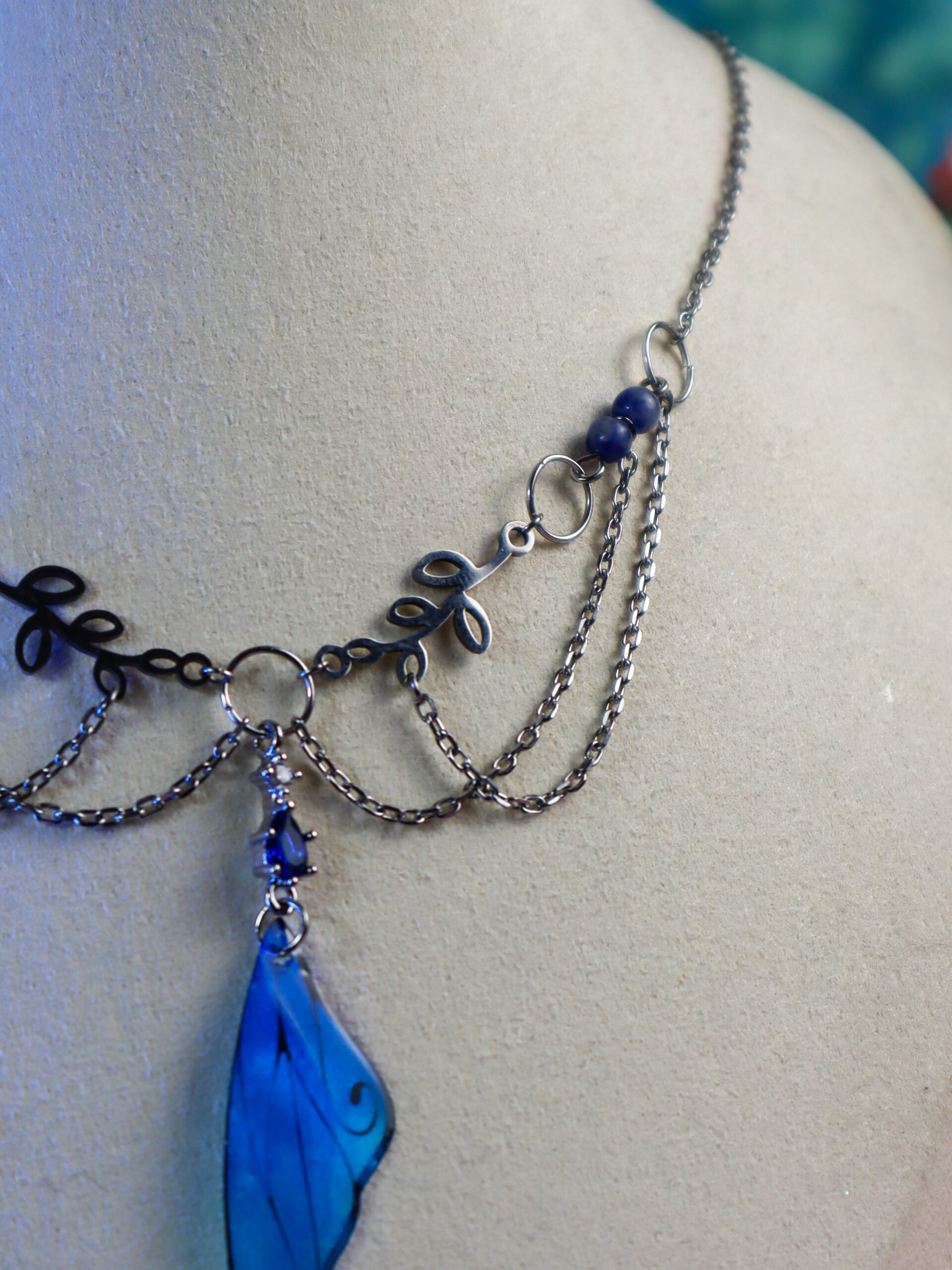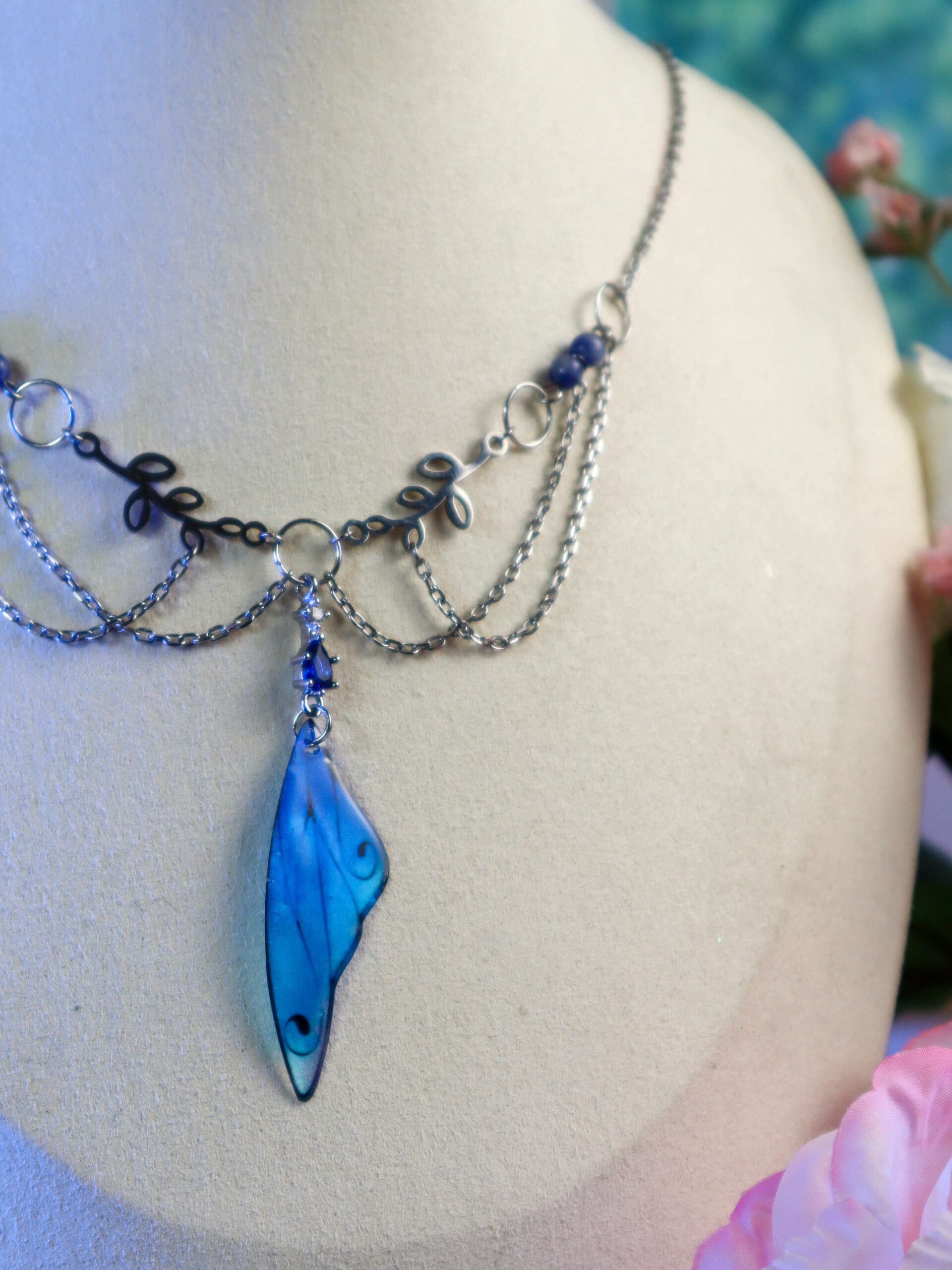 Ainsi, autour d’une aile aux tons bleutés — dégradé de bleu profond vers le blanc nacré, parcouru de reflets irisés — s’enroulent des chaînes délicates, des connecteurs en forme de branche et des perles de sodalite du Brésil de 4 mm. De plus, chaque perle porte en elle les nuances bleues et blanches de l’élément Eau, ce qui renforce l’harmonie de l’ensemble. C’est pourquoi ce collier féerique travaillé eau forme une pièce unique, à la fois structurée et organique.