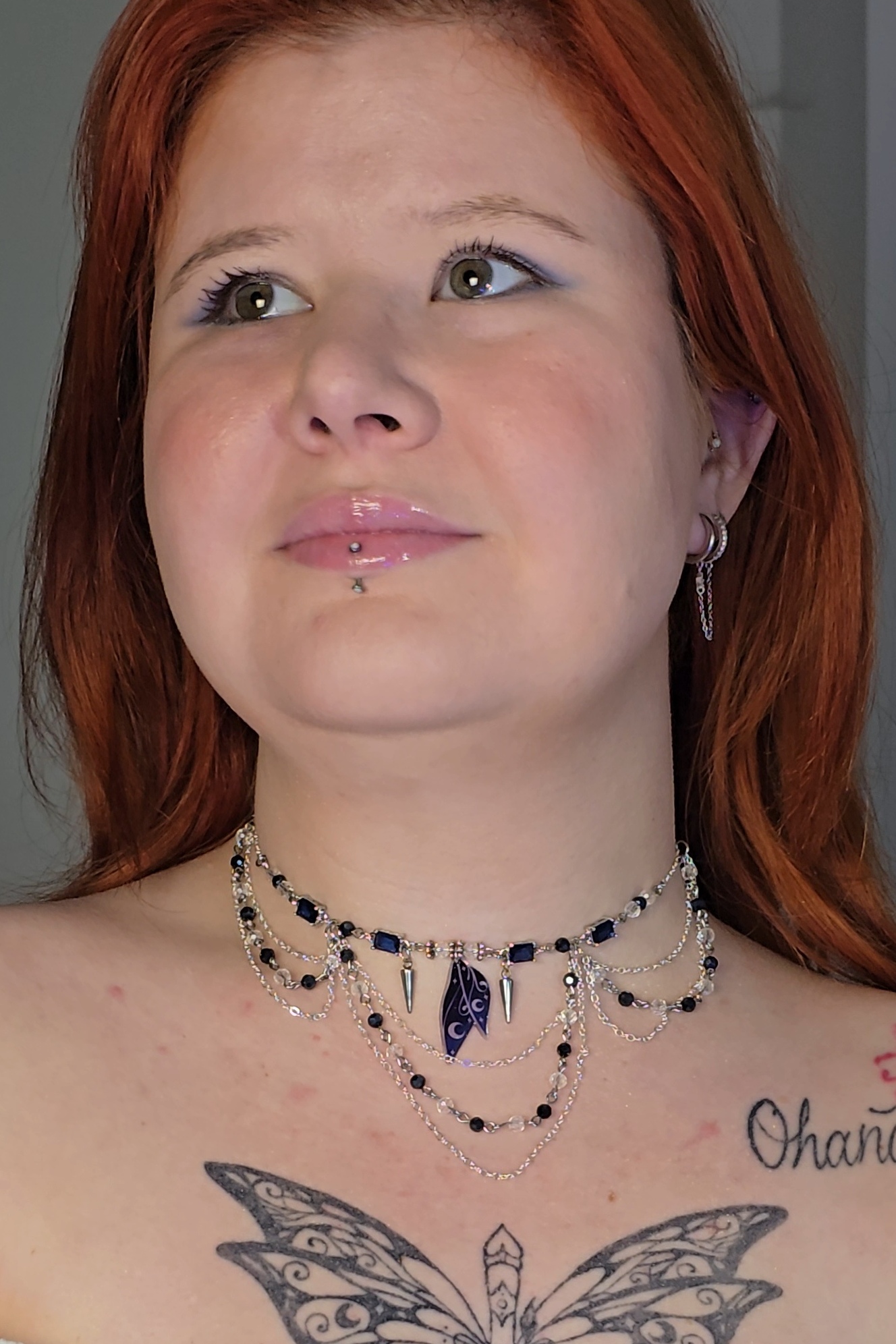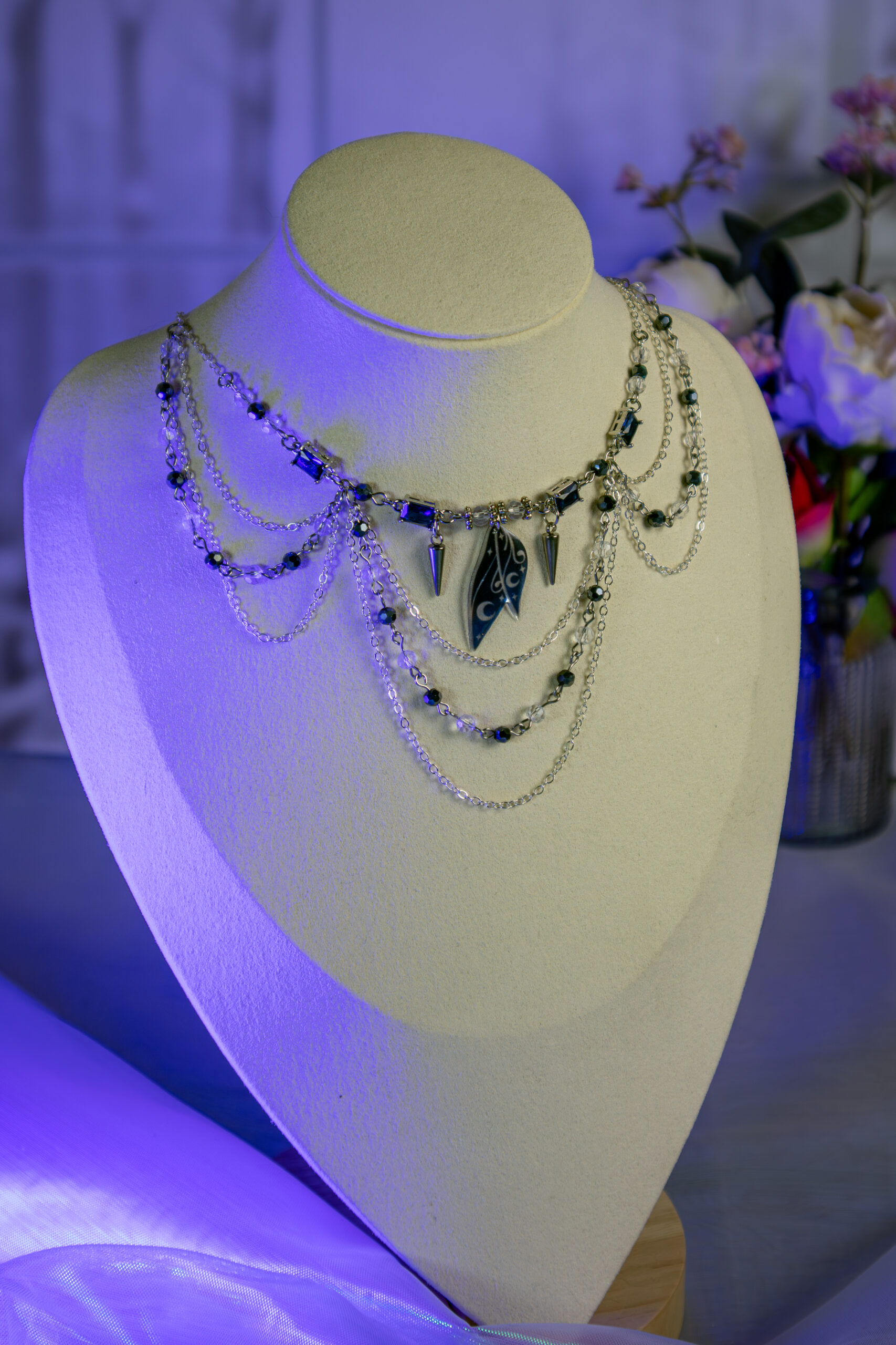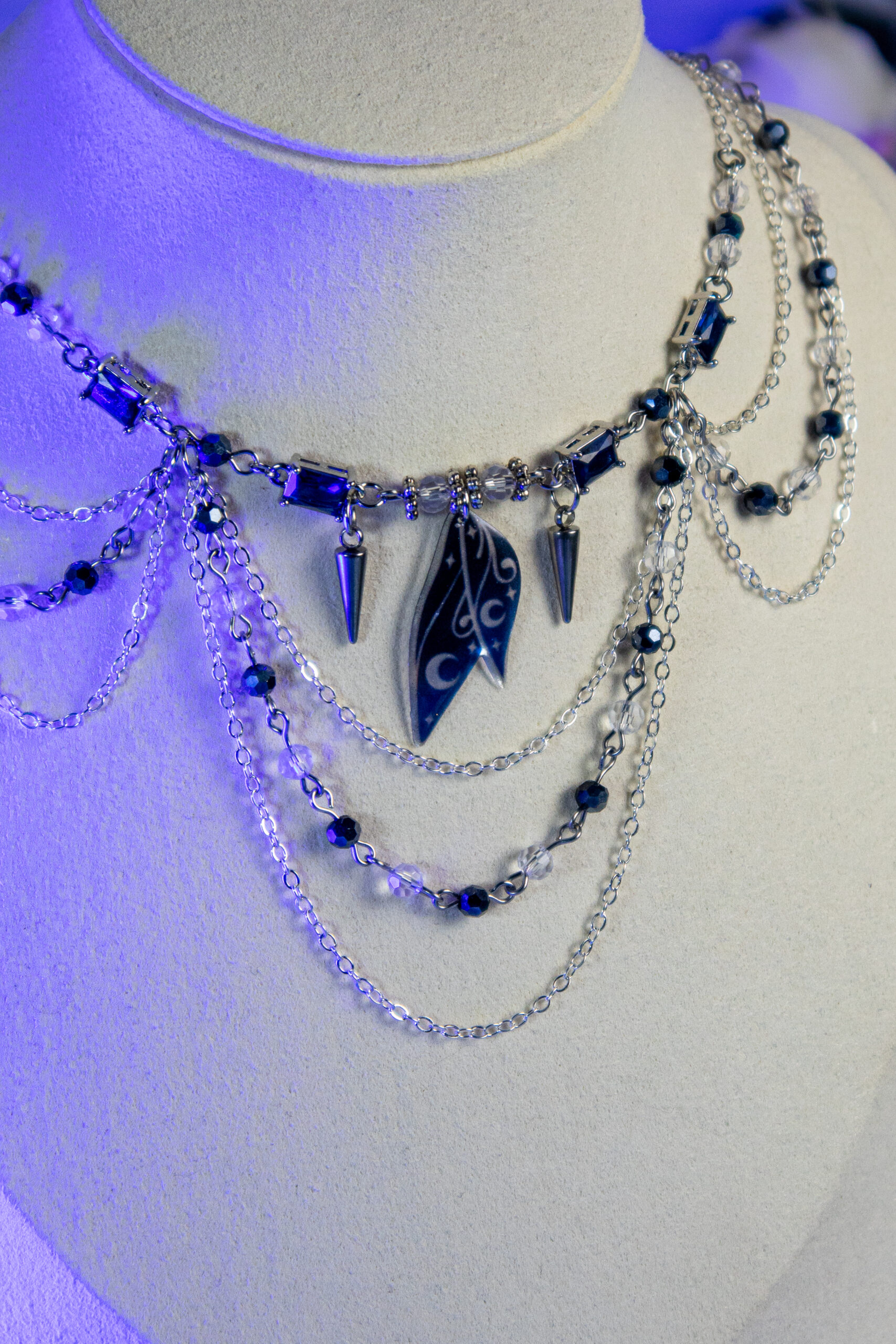 Un collier enchanté, bleu nuit et argenté, façonné avec les pierres de Séléné.