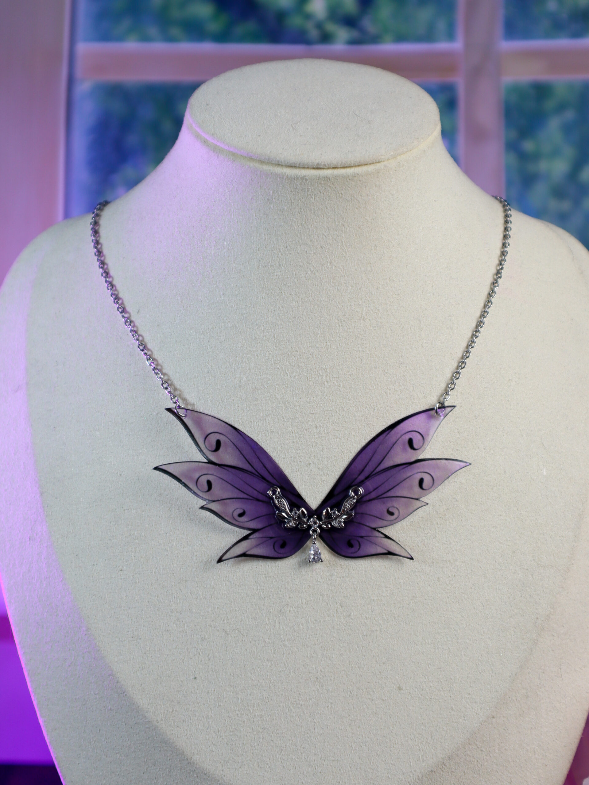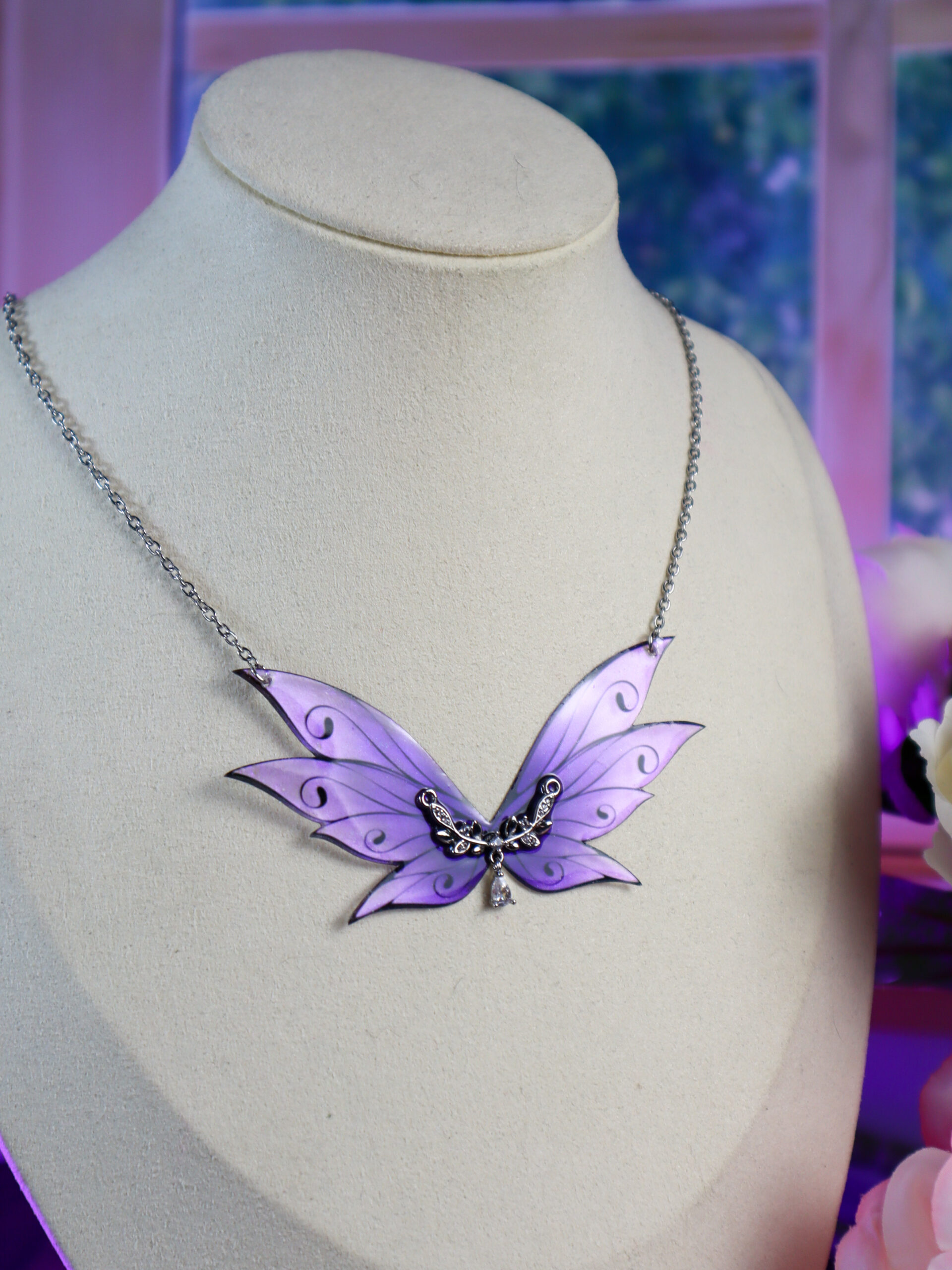 Ses six ailes réunies en pendentif central forment un grand collier féerique air aux tons éthérés, avec un dégradé qui va du violet profond vers le violet gris, parcouru de reflets irisés mauves qui captent la lumière à chaque mouvement. Un bijou fait main, unique, qui ne ressemble à aucun autre.