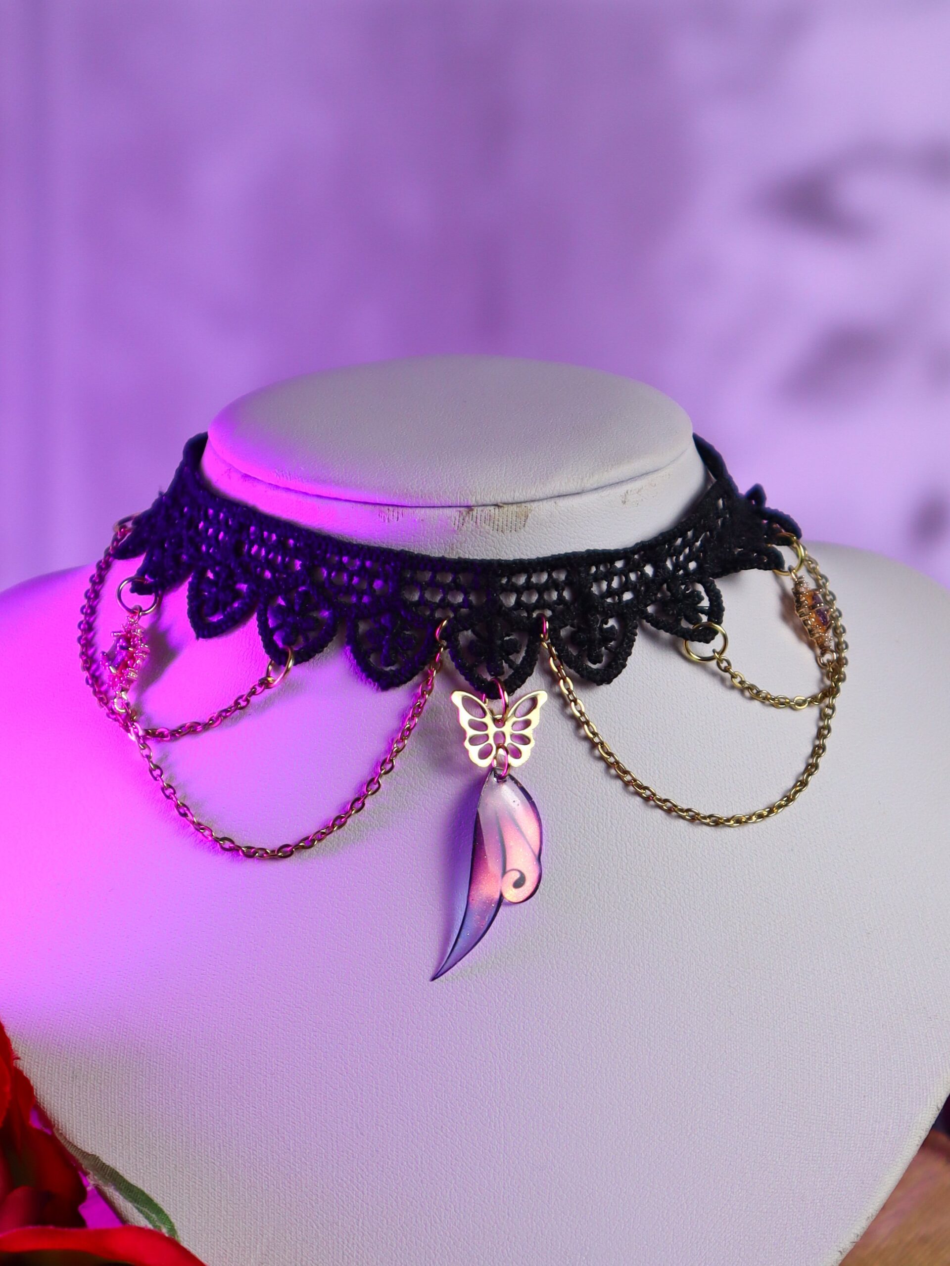 Laisse-toi envoûter par ce choker chrysalys aux allures mystiques, où l’élégance sombre rencontre la magie des couleurs. La dentelle noire délicate épouse ton cou avec raffinement, tandis que de fines chaînes dorées ajoutent une touche précieuse et lumineuse. Au centre, une aile violette aux reflets dorés scintille comme un fragment de crépuscule enchanté. Surplombée d’un petit papillon doré, elle incarne la métamorphose et la grâce aérienne, rappelant les créatures féeriques qui dansent entre ombre et lumière.