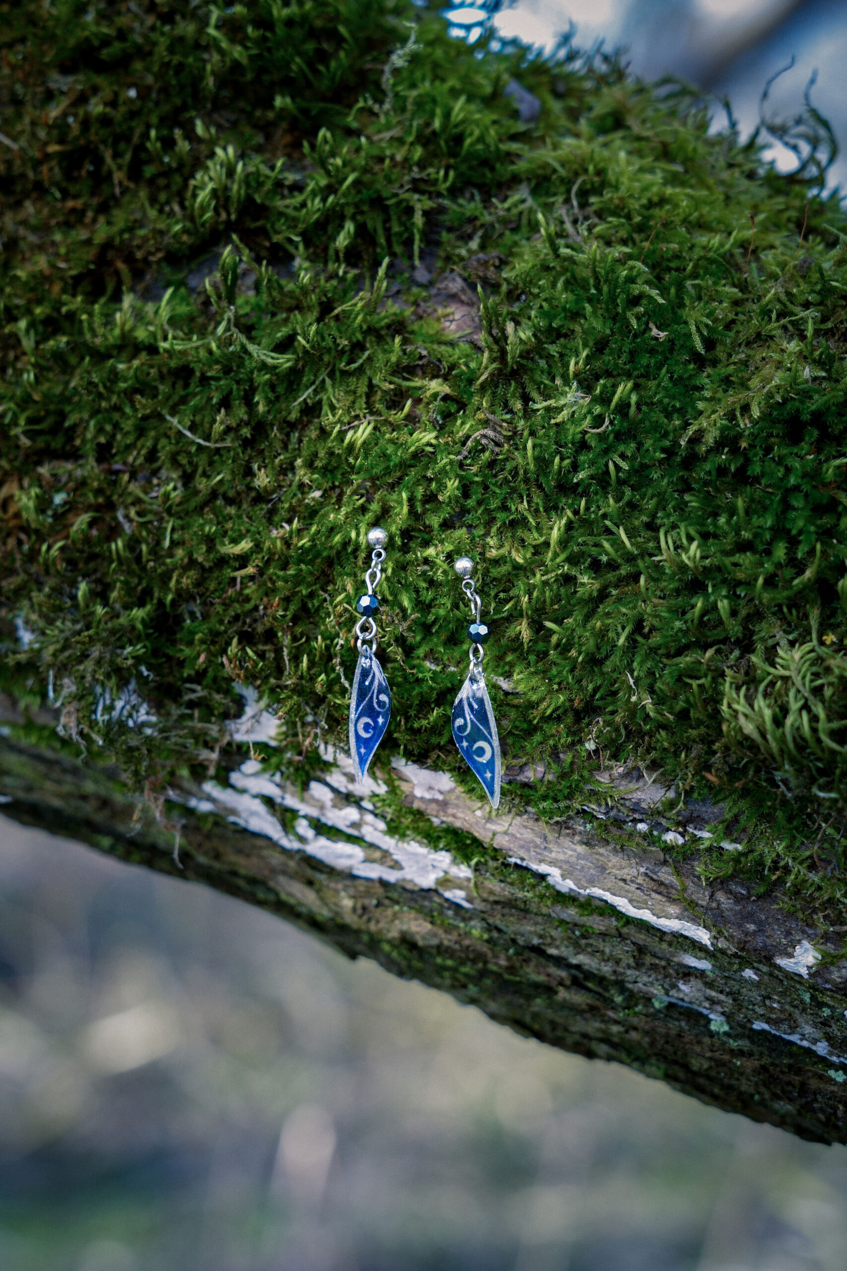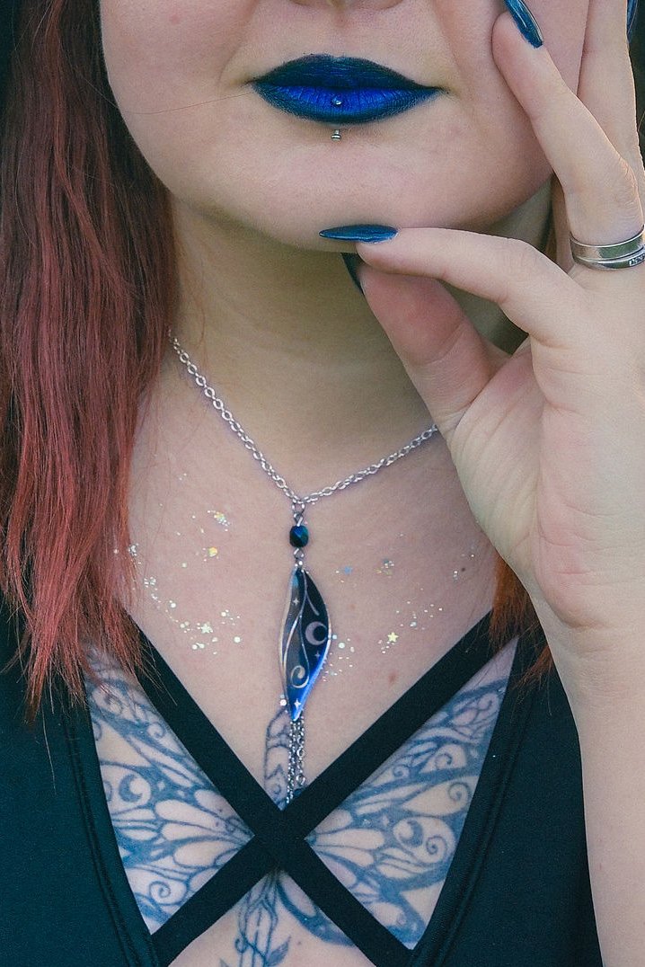 J’utilise de l’acier inoxydable pour garantir solidité et confort. Le pendentif réunit deux petites ailes de fée recouvertes d’une résine non toxique et un cristal Swarovski qui capte la lumière avec intensité.